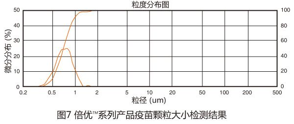 倍優?系列產品每一個疫苗毒株均單獨接種雞胚,分別采毒后經超高超微分離濃縮后再純化,高度去除雞胚尿棄液中的尿酸鹽、脂多糖等雜質,經過高度純化和超高濃縮后,在進行抗體復配,確??乖煞謫我?,從而保證乳化后的疫苗顆粒大小適中、均勻,有效刺激機體產生高而待久的抗體水平;倍優?系列產品疫苗顆粒大小0.5~0.6μm ,該大小顆粒占95%以上(圖7)。